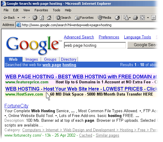 Also, notice the first two web pages listed in Google’s results are both in BOLD? The reason that Google does this is to show the general public that these two web page companies actually PAID Google to be ranked in the top of their Search Engine results under the keyword phrase "web page hosting." They did not EARN their way to being ranked at the top of Google’s results under "web page hosting" like “FortuneCity.com.” A different kind of website Ranking System is a company known as Overture.com.