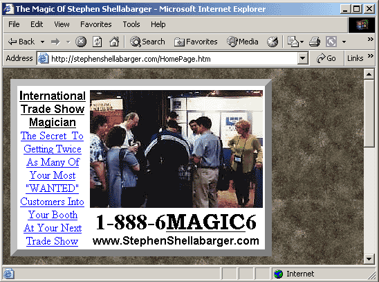 Be prepared to sit back and relax for a few minutes as you wait for it to load. Using a 56K modem, it may take over 5 minutes to load! Because balthaser.com is nothing more than an online Flash presentation, there is no general text for the Search Engines to read within their website except for their Title, Description, and Keyword Meta Tags (found within their HTML coding). This makes it almost impossible for the Search Engines to rank balthaser.com high in their results. To prove my point, try this little experiment: try highlighting the text on their web page with your mouse or try holding down the ... “Control”... key on your computer's keyboard and then hit the ... “A” ... key on your computer's keyboard (this will "select all"). Did you notice there was nothing on the screen to select like there is on a regular web page? We L@@K at the text with our eyes, but the Search Engines can only READ the text from within your web page’s HTML coding. Now let us try a different experiment. Try going to www.WebpagePublicity.com and highlighting the graphics of our web page with your computer’s mouse (or hold down the... “Control”... key on your computer's keyboard and then hit the ... “A” ...). Did you notice how there were actually graphics to select on the screen this time? If you cannot highlight the text on the screen with your mouse, that means the Search Engines cannot read the text on the screen either. This is what you will experience when your website is built entirely of Macromedia Flash. Another drawback to building your website out of Macromedia Flash is that if your customers do not have the Macromedia Flash Plug-In downloaded to their computer, they will NEVER be able to see what your website is about. The problem with this is not everyone has the Flash Plug-In on their computer and not everyone is going to go through the trouble of downloading the plug-in, especially if they have never seen your website before. By building your website out of Macromedia Flash, it generally takes a LONG time for the Flash presentation to load. Normal websites load in three to five seconds over a 56K modem, but Macromedia Flash presentations can take anywhere from thirty seconds for small files to five minutes or more for larger files to load. No one likes to wait a long time for a web page to load, especially when they have no idea what your website is about. For instance, my experience was that my friend told me to go to Balthaser.com; I thought that my computer browser had locked up on me. I tried closing the program down and then re-accessing Balthaser’s website all over again. After I had gone back to Balthaser’s website three times, and it still was not loading for me, I finally decided to shut down and restart my computer. I then tried re-accessing Balthaser’s website all over again, but it still did not load. Finally, because it was a flash presentation, I figured it might be in the process of loading, so I sat back and waited. After 28 seconds, over our DSL Internet access, Balthaser FX’s website finally loaded for me. The only reason I went through so much trouble to find out what Balthaser.com was really about was because my friend asked me to go there. Normally, I would never wait that long for a website to load. So remember, if your website takes longer to load than the general website, that could mean the general public may never find out about your online business. I am not saying that you should never put a movie or a Flash presentation in your website because there is definitely power in a sales presentation video. But, your online business’ information should be separate from your Flash Presentation. You should give the general public the option of reading what your online business is about OR watching an online Flash presentation about your online business.