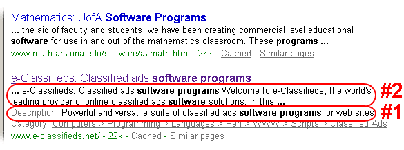 The whole purpose behind web page cloaking used to be to prevent the general public from stealing your web page’s HTML coding, then using it in their own website. This allowed them to have their website ranked at the top of the Search Engines, just like you did. Instead of Cloaking their website to keep people from stealing their HTML coding, they were Cloaking their website to try and have their website ranked at the top of the Search Engine’s results using the most general and most popular Keyword Marketing Phrases. This is why the Search Engines started reading ALL of the text on the web pages instead of reading only the text that is located in the Cloaked web page. Search Engines do this as their way of finding out EXACTLY what that web page is about before they list that website in their results. We at the Webpage Publicity Agency do not recommend Cloaking, or provide it to our clients, because it has become so outdated and many people have abused it. Search Engines are not looking to send the general public on a wild goose chase by listing web pages that have absolutely nothing at all to do with their search. Instead, they are looking to suggest the most popular web pages that have the best content and are specifically targeted toward what the general public asked the Search Engines to find. If a Search Engine catches you Spamdexing, making them view a totally different Cloaked web page than your official web page, this could lead to a Search Engine never listing your website again. Take Google for example. They not only list the web page’s “Description” in their results (#1), but they also have a small section of actual text from the front page of that website (#2) to display to the general public in their results.